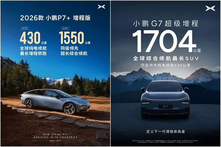 12 月 29 日和 12 月 30 这两天,小鹏先后官宣了 2026 款 P7+ 和 G7 的超级增程版本,刷新了增程轿跑车和 SUV 的续航纪录。