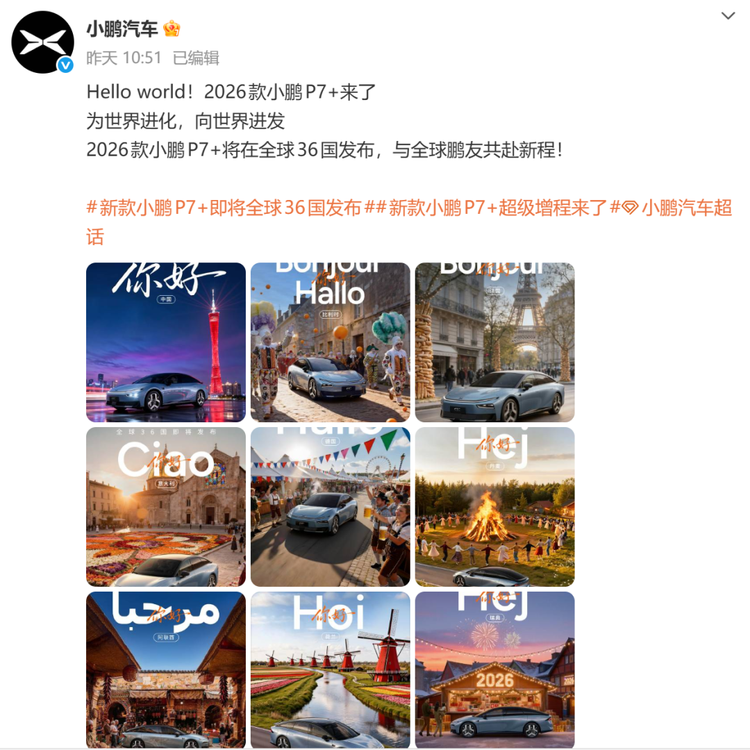 增程布局紧扣小鹏汽车的出海战略,作为旗下第二款超级增程车型,2026 款 P7+ 将在全球 36 个国家同步上市。