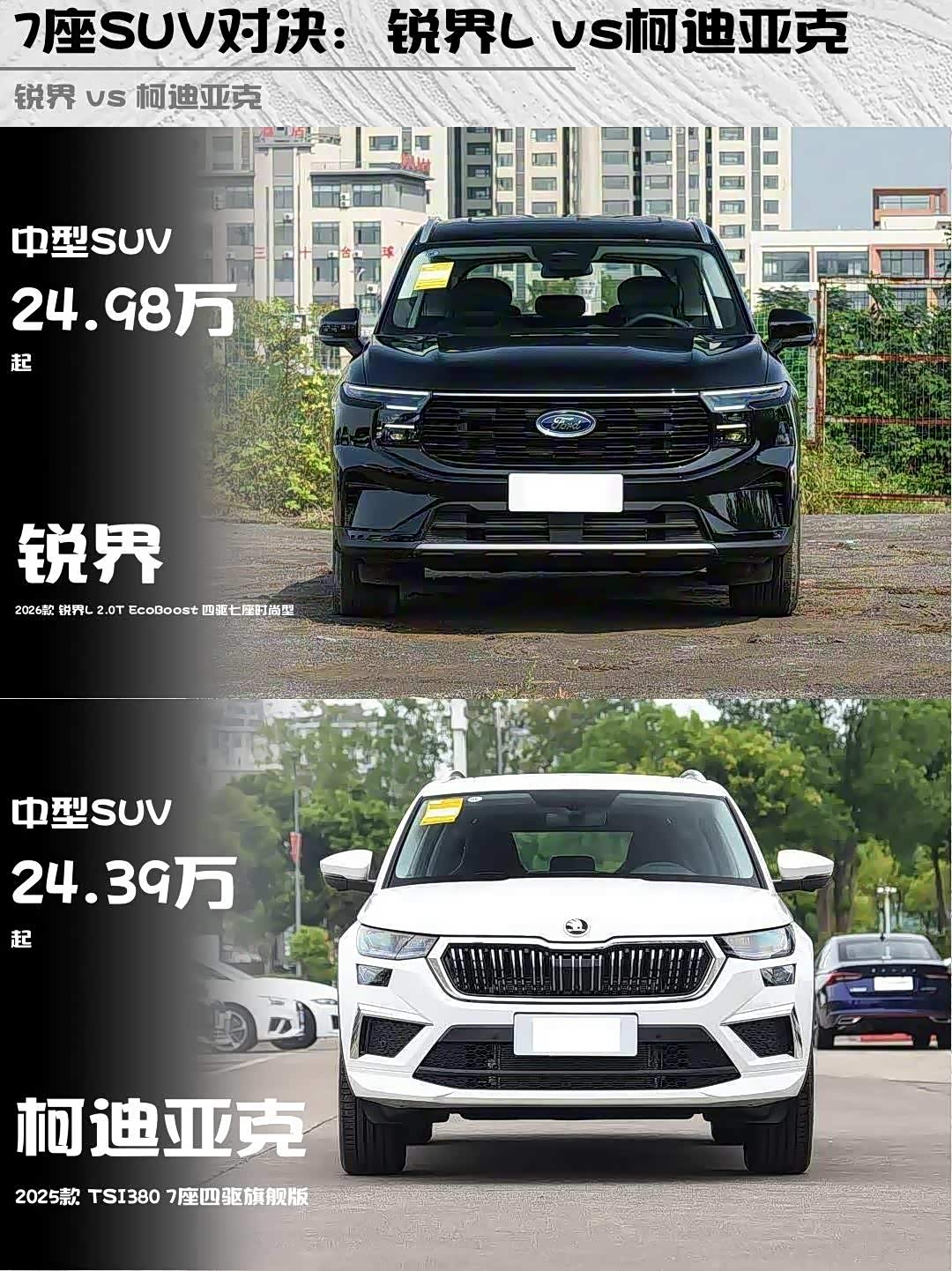 最近后台好多兄弟在问25万预算买7座SUV怎么选,今天直接拉出两台热门选手——2026款锐界L 2.0T四驱七座时尚型(24.98万)和2025款 柯迪亚克(参数|询价)TSI380四驱旗舰版(24.39万)硬核对比!看完这篇你绝对不纠结🔥