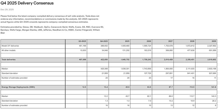 这一数字与彭博社统计的44万辆左右的市场共识预期相比更为悲观。特斯拉方面则明确表示“不认可分析师的任何信息、建议或结论”,仅客观呈现汇总后的共识数据。