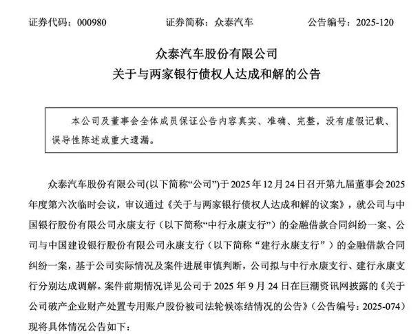 2025年12月24日晚,众泰汽车发布公告,宣布已与中国银行永康支行、建设银行永康支行达成和解协议,暂时避免了资产被查封拍卖的命运。