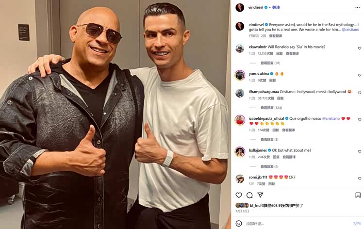 近日,足球圈和电影圈都热闹起来了,皆因以下这篇社交媒体帖子的出现!知名影星范迪塞尔在社交媒体上发布一张合照,并附上帖文:“大家都想知道,他会出现在《速度与激情》里面吗?我要告诉你们这件事成真了,我们为他打造了一个神秘的角色!”另外一位主演泰瑞斯·吉布森也在社交媒体发布了和C罗的剧组合照。