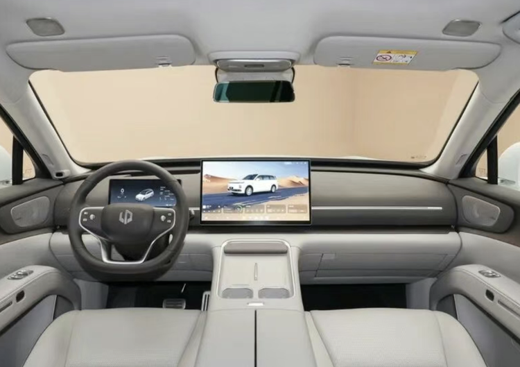 内饰部分,零跑D19同样延续家族式布局,整体风格极简纯粹,车内物理实体按键大幅精简,空调出风口采用隐藏式设计,搭配双拼配色与氛围灯的烘托,豪华质感相较于零跑现有车型有明显提升。座舱配备10.25英寸液晶仪表+17.3英寸中控屏的双联屏组合,搭配60英寸AR-HUD抬头显示系统,三幅式多功能方向盘搭配电子换挡机构,科技感十足。