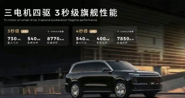 其中增程版基于800V高压平台打造,搭载1.5T增程器,其三电机版本的系统综合功率可达400千瓦,百公里加速进入4秒级区间;电池方面匹配容量为80.3千瓦时的宁德时代电池组,CLTC纯电续航可达500公里。