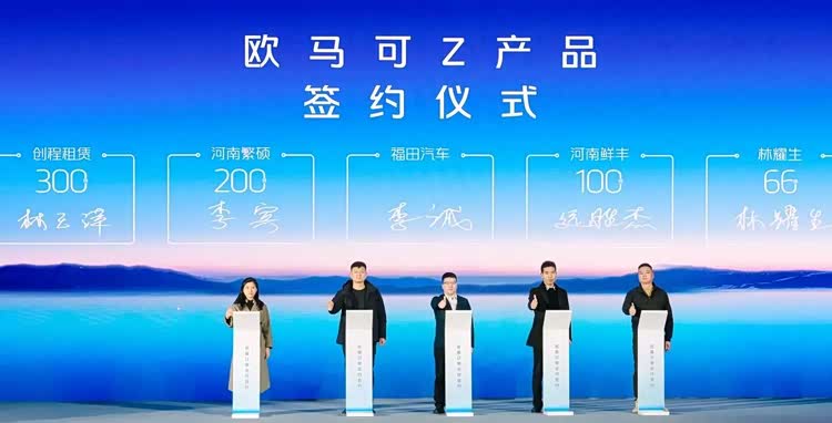 活动现场,福田汽车先后完成欧马可 Z、奥铃极电、卡文乐途三大品牌批量订单签约,总签约量达 1682 辆。