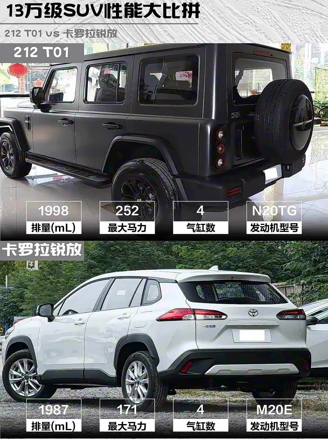 先看动力表现👉 212 T01的2.0T机械师简直是个暴躁老哥!252马力+410N·m扭矩,配上分时四驱和后桥差速锁,爬坡过坎跟玩儿似的。实测越野时油门跟脚,悬挂行程超长,冲坡时发动机轰鸣声听着就上头!不过代价是市区油耗轻松13L+,加油时钱包会哭😭 而卡罗拉锐放的2.0L+CVT组合就像个经济适用男,6.42L的油耗真香,但205N·m扭矩跑山路时得深踩油门,发动机干吼的声浪略显单薄。