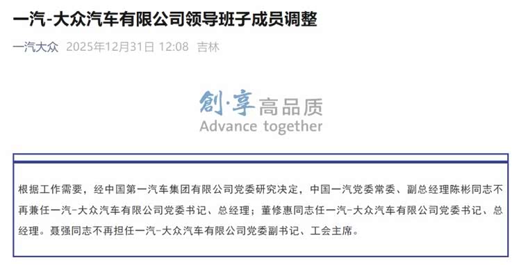 随着上述公告的发布,此前坊间热议多日的一汽-大众管理层调整传闻,在2025年收官之日正式得到印证。