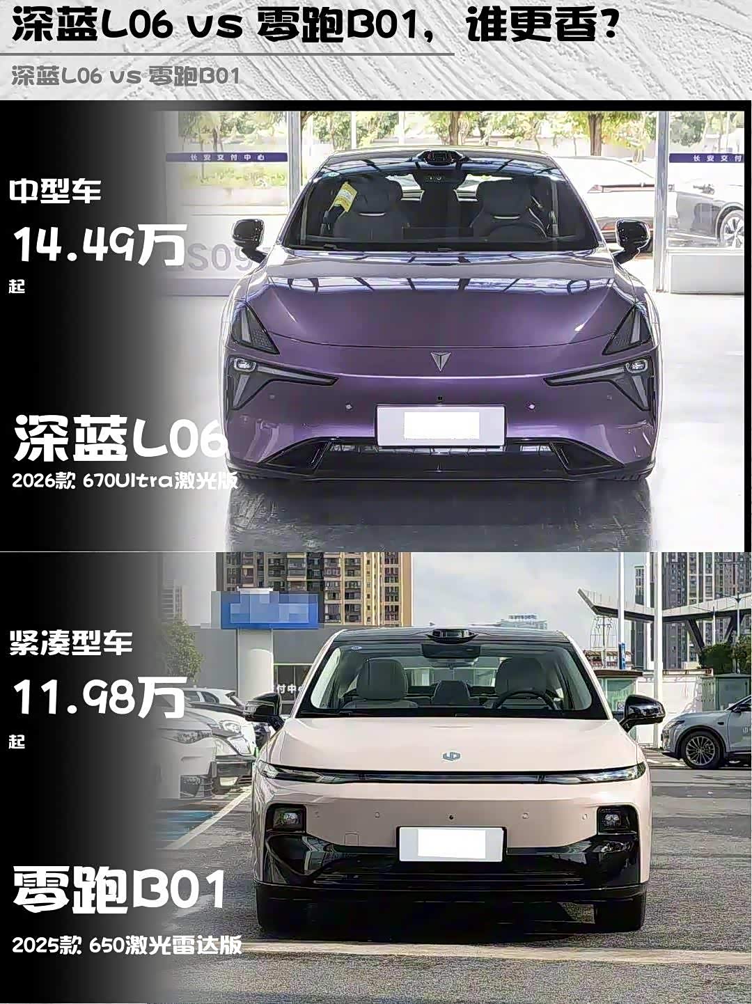 最近深度体验了两款15万级纯电轿跑—— 深蓝L06(参数|询价) 2026款 670Ultra激光版和零跑B01 2025款 650激光雷达版,发现这两台车简直是两种性格的极端!作为理工男必须来波硬核对比🔥
