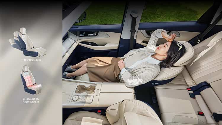 更令人称赞的是,风云T9的二三排座椅支持一键放倒,瞬间秒变2.1㎡的大床,让长途旅行中的休息变得前所未有的舒适与惬意。而SPA级舒享座椅的配备,更是将舒适体验推向极致,主驾的10向电动调节与10点按摩功能,让驾驶者能在旅途中享受如居家般的放松;女王副驾的一键舒躺模式,坐垫靠背最大开启角度高达125°,让副驾乘客也能拥有专属的尊贵体验。