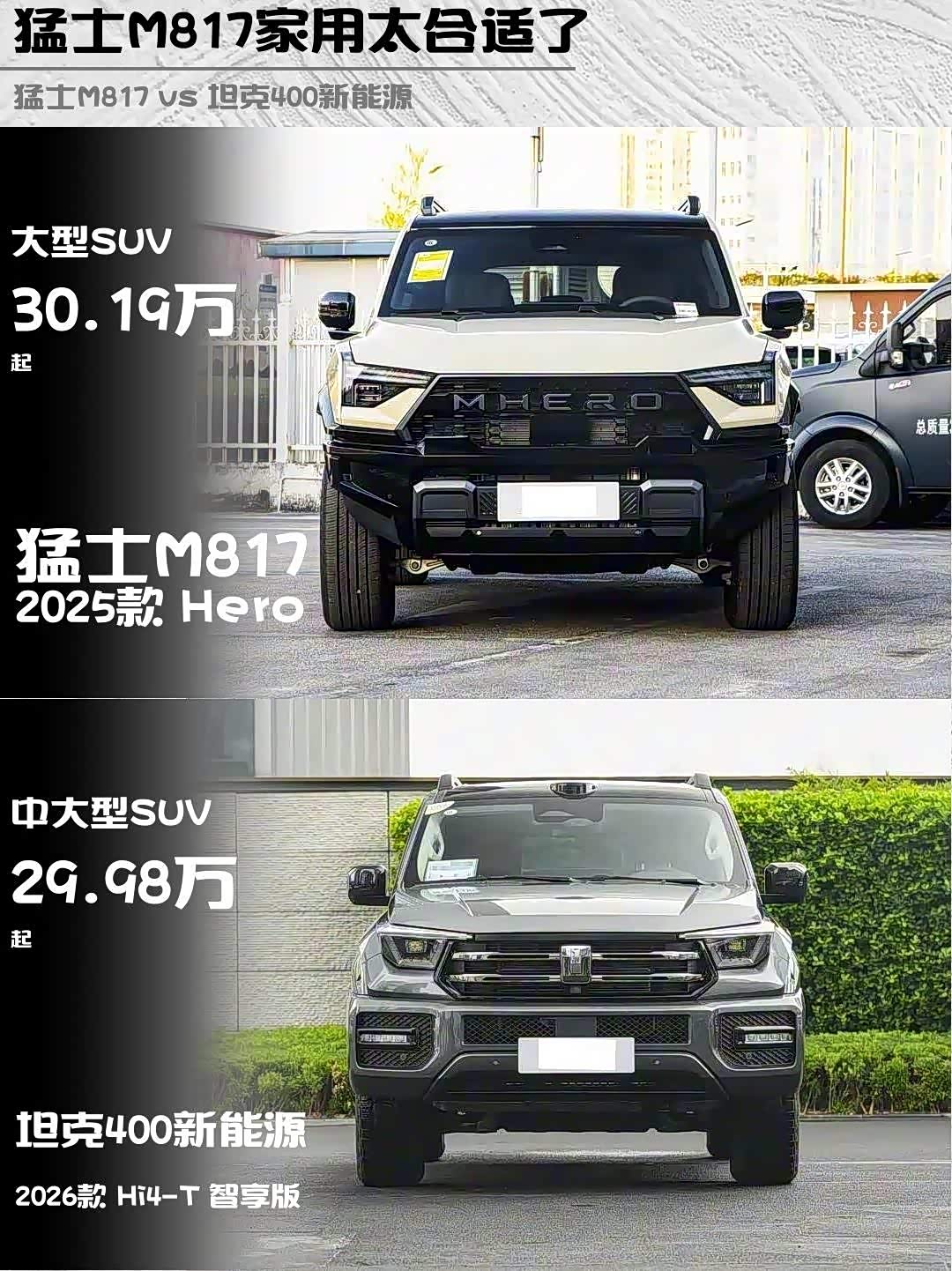 最近后台好多兄弟在问猛士M817 2025款 Hero和 坦克400新能源(参数|询价) 2026款 Hi4-T 智享版怎么选?作为深度体验过两台车的越野老炮,今天直接上干货对比!🔥