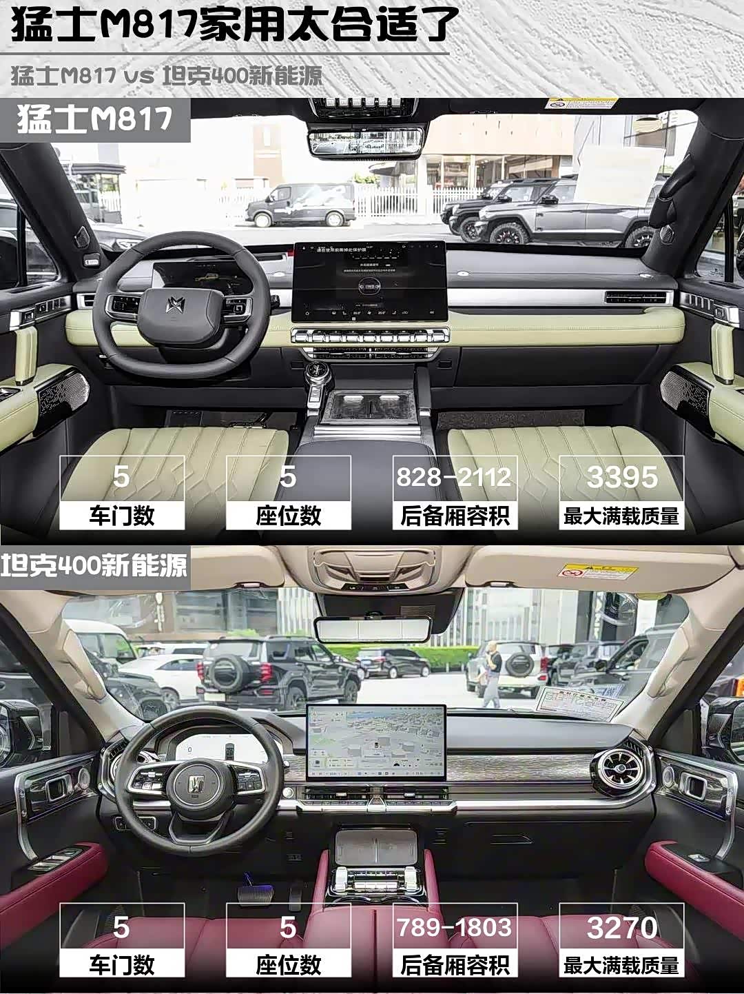 ▶️越野配置:两车都带三把锁+蠕行模式,但猛士后轮转向系统太香了!5.1米车长转弯半径堪比高尔夫,窄路调头不用来回揉方向盘。坦克的800mm涉水深度倒是比猛士多出50mm
