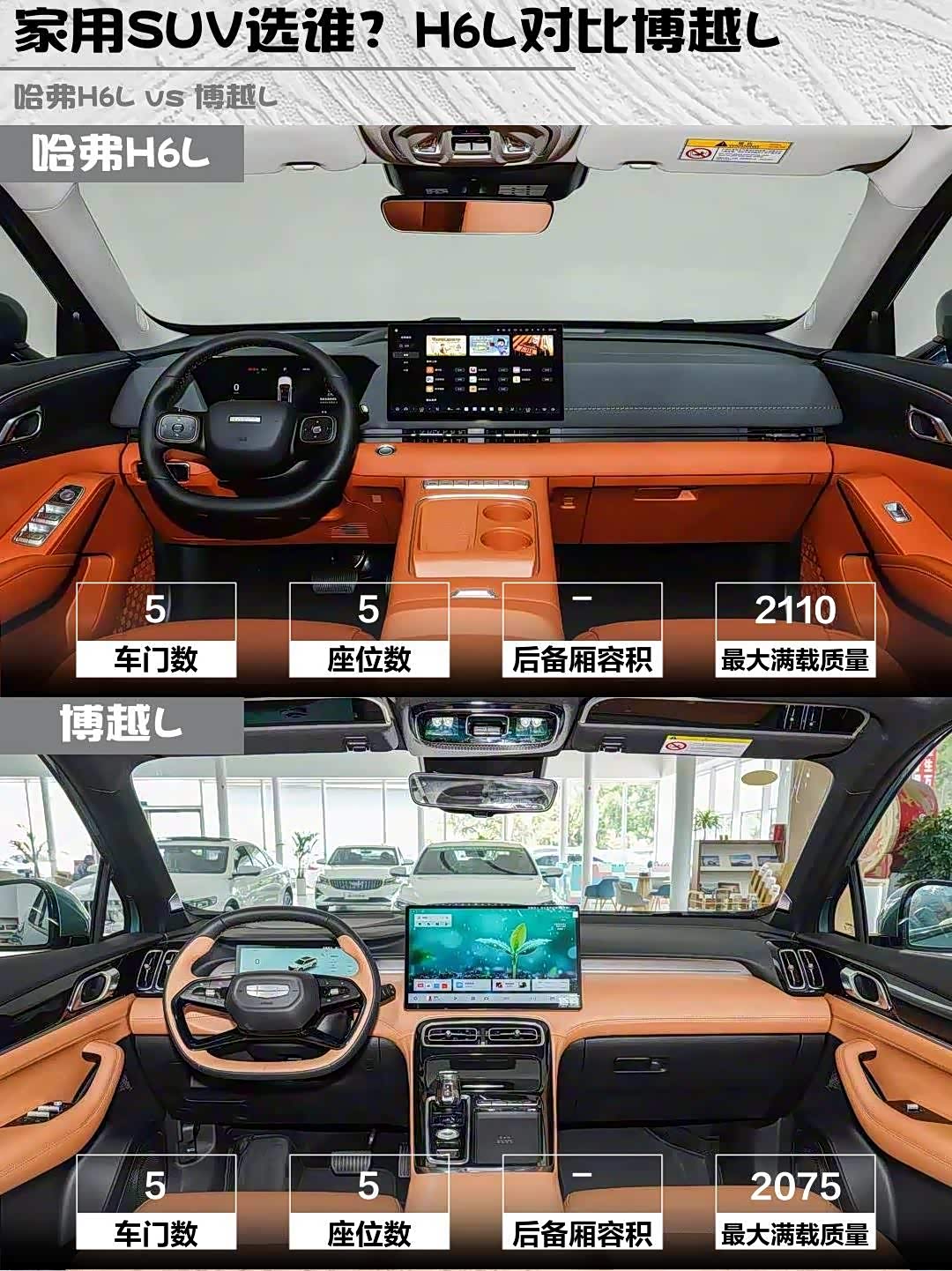 底盘调校差异最大:H6L过减速带像踩棉花,博越L路感更清晰。喜欢驾驶的选博越L,家用带娃首选H6L。个人最种草H6L的座椅通风/加热/按摩三件套,夏天后背再也不湿透了💦