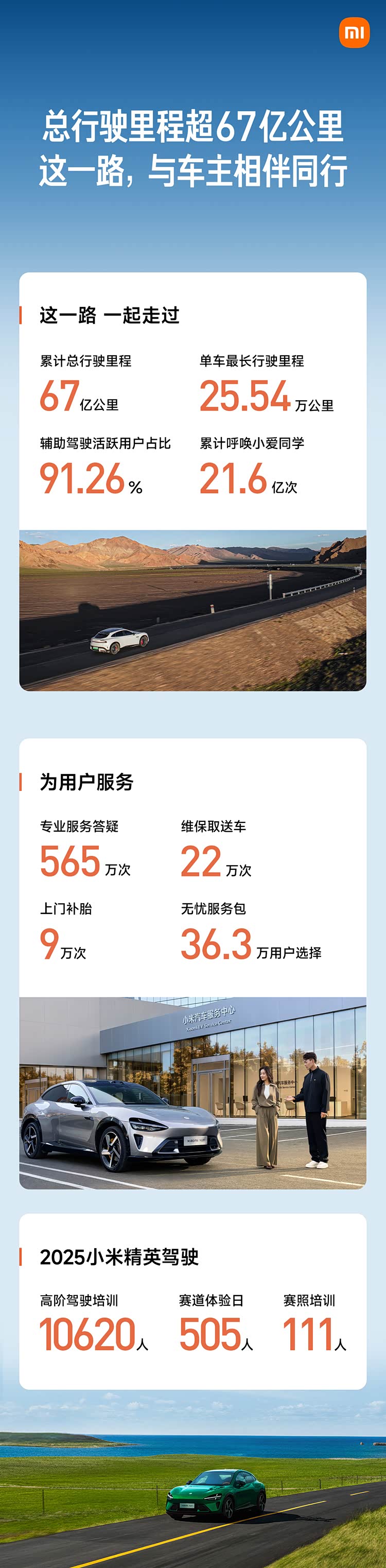 驾驶方面,小米汽车总行驶里程超67亿公里,单车最长行驶里程高达25.54万公里,辅助驾驶活跃用户占比91.26%,累计呼唤“小爱同学”21.6亿次。门店方面,小米汽车已开业门店477家,覆盖138座城市,服务网点覆盖151座城市、264家。