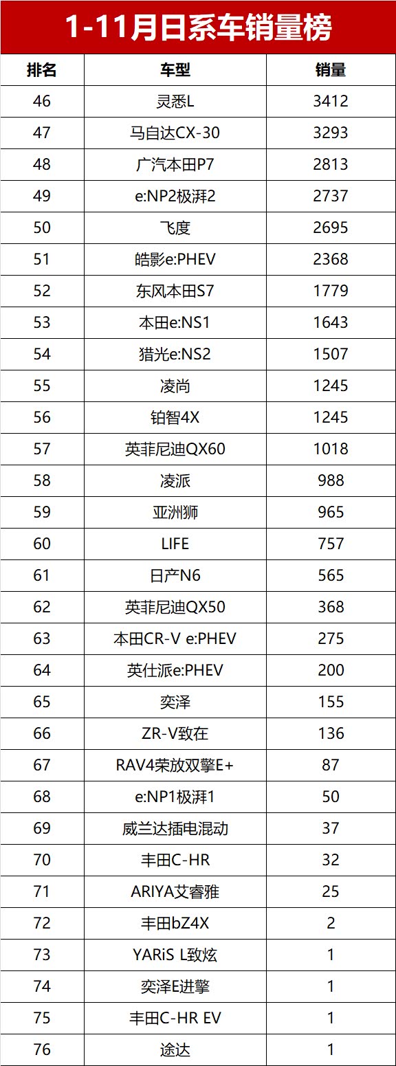 最令人意外的是多款日系新能源车型的惨淡表现,成为榜单中的“失意者”。丰田bZ4X累计销量仅2辆,bZ3(19978辆)、bZ5(11283辆)虽表现稍好,但与自主品牌新能源车型相比差距悬殊;本田纯电车型同样乏力,e:NP1极湃1仅50辆,e:NP2极湃2(2737辆)、本田P7(2813辆)等车型销量均未突破3000辆,即便限时降价也未能撬动市场。此外,多款曾经的主流车型销量暴跌,本田飞度仅2695辆,凌派(988辆)、亚洲狮(965辆)等车型销量不足千辆,奕泽(155辆)、ZR-V致在(136辆)更是濒临退市边缘。英菲尼迪两款车型QX60(1018辆)、QX50(368辆)销量低迷,进一步印证了豪华日系品牌在华的边缘化困境。