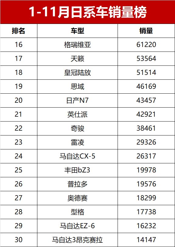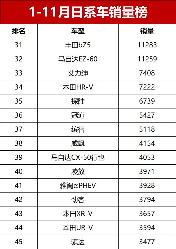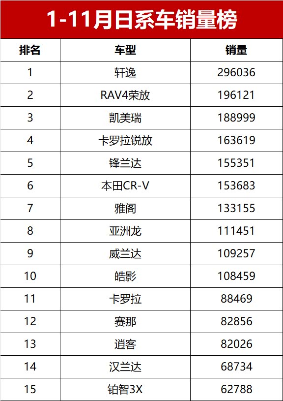 【2025年1-11月国内日系车零售销量排行榜】近年来日系车在中国市场的处境愈发艰难,在自主品牌强势崛起与电动化浪潮的冲击下,销量持续承压。乘联会数据显示,2025年1-11月国内日系车市场累计零售销量为261.3万辆,同比减少6.1%,市场份额从2022年的20.0%大幅萎缩至如今的12.2%。反观自主品牌,今年前11个月乘用车市场零售销量同比增长15.1%,市场份额已突破65%,两者形成鲜明反差。日系阵营内部格局也有所分化,丰田以143.2万辆的累计销量占据55%的日系市场份额,本田、日产分别以57.8万辆和52.8万辆紧随其后,马自达仅7.5万辆,英菲尼迪更是低至0.14万辆。那么,今年前11个月哪些日系车型仍能稳住阵地,哪些车型已跌落神坛?下面我们一同来看详细榜单。