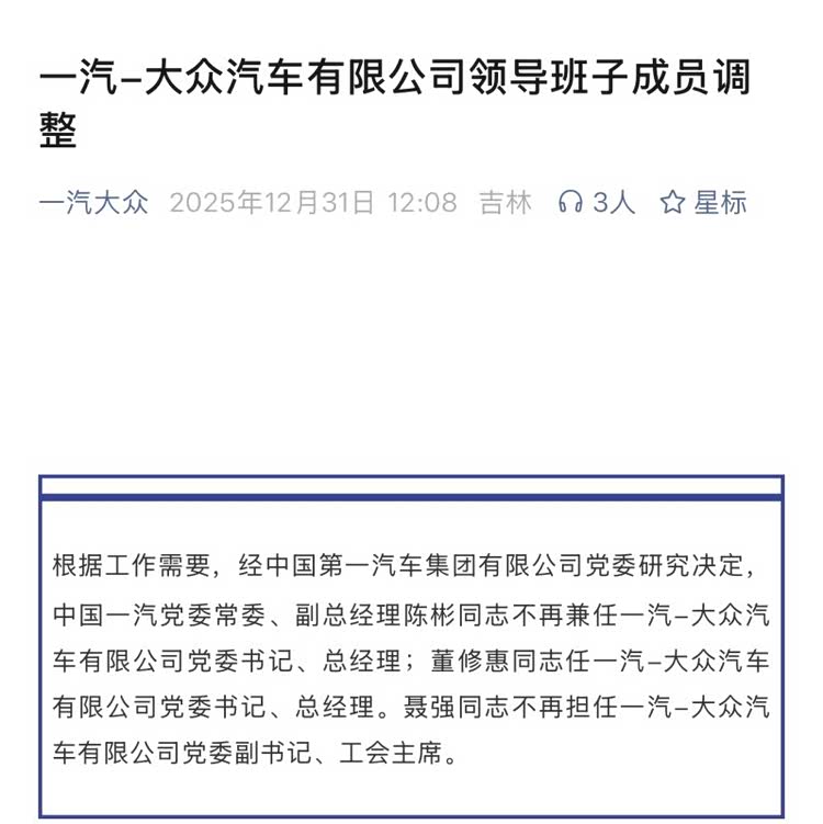 12月31日,一汽-大众官宣,经中国第一汽车集团有限公司党委研究决定,中国一汽党委常委、副总经理陈彬不再兼任一汽-大众汽车有限公司党委书记、总经理;董修惠任一汽-大众汽车有限公司党委书记、总经理。聂强同志不再担任一汽-大众汽车有限公司党委副书记、工会主席。