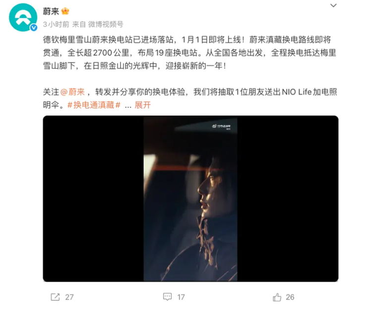 车家号·0浏览·2025-12-31 17:06 · 广东12 月 29 日,蔚来官方宣布德钦梅里雪山蔚来换电站已进场落站,1 月 1 日即将上线。蔚来滇藏换电路线即将贯通,全长超 2700 公里,布局 19 座换电站。