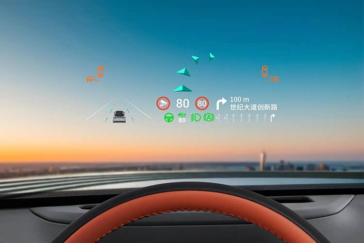 第五,内饰方面,该车配备了15.6英寸2.5K中控屏幕,没有配备仪表盘,而是通过55英寸AR-HUD投屏取而代之,投屏信息十分丰富,可以把AR实景导航、高德地图、时速、电量等信息映射到前挡风玻璃上。另外,在副驾驶的化妆镜位置,还配备了一块12.3英寸的娱乐屏幕。
