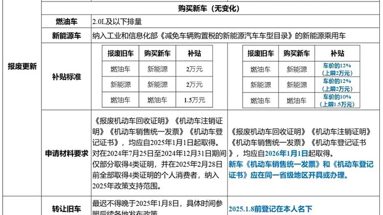 2025年的政策在旧车报废更新方面,已经较早期政策有所扩大,将部分符合条件的“国四”排放标准燃油乘用车纳入了补贴范围,并明确了燃油车(汽油、柴油及其他燃料)和新能源乘用车的具体注册登记截止日期。