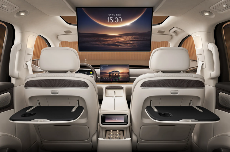 内饰确实可以称得上是目前零跑汽车品牌真正的旗舰了,几乎是把现在主流的内饰舒适功能配置都给拉满,特别是第2排头等舱的感觉比较到位,车顶提供有折叠的大电视,折叠大桌板面积也不错,当然也少不了大容量的双温冰箱。