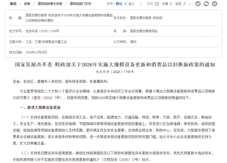 12月30日,国家发改委、财政部印发《关于2026年实施大规模设备更新和消费品以旧换新政策的通知》,明确汽车新国补细则,补贴如期而至。