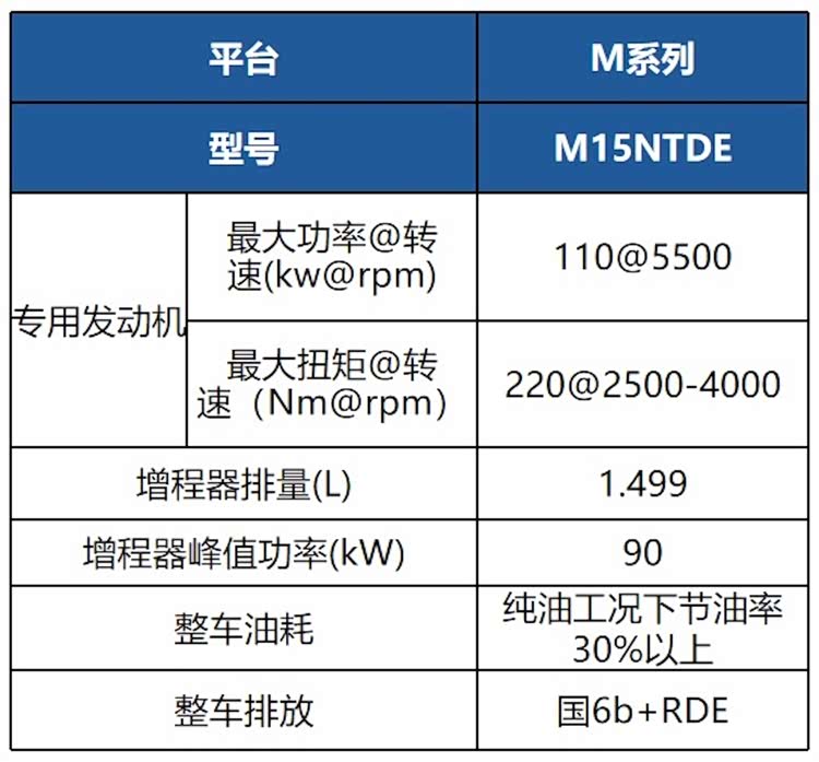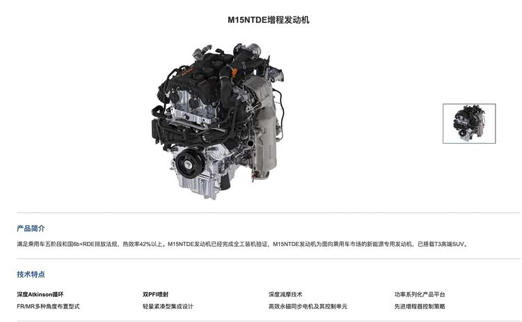 跑偏了,我们回到技术本身,根据东安动力官网数据显示,该增程器专为增程系统『电为主、油为辅』工况深度优化,增程器排量1.499L,满足国6b+RDE排放法规,热效率达42%以上,采用深度Atkinson循环、双PFI喷射及深度减摩技术,有效降低燃油消耗与运行噪音。其最大功率110kW(5500rpm),最大扭矩220N·m(2500-4000rpm),峰值发电功率90kW,最大发电功率85kW,可支撑车辆在亏电状态下保持150km/h高速稳定巡航。
