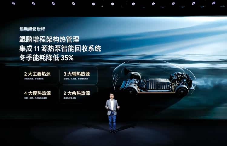 而热管理系统是能耗控制的关键环节,「鲲鹏超级增程」搭载了十一源热泵智能回收系统,通过九通+六通+三通水阀联合控制,实现11个热源的高效回收,包括2大主要热源(PTC、增程器余热)、3大辅热(压缩机、中冷器、电驱辅助加热)、4大废热热源(电驱、电控、芯片及电池废热)、2大余热热源(座舱及环境余热)。