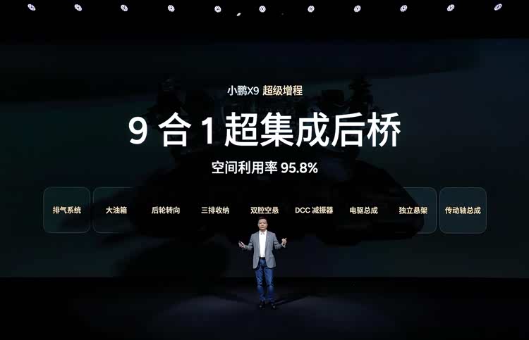 比如在空间集成能力方面,9合1超集成后桥,使其在小鹏X9超级增程可在极小的后桥空间内集成更多的功能,同时保留超大三排乘坐空间与灵活储物能力,第三排腿部空间优于竞品,180mm宽的二排过道允许10岁儿童自由活动,这种空间利用效率源于小鹏在纯电车型上积累的一体化压铸技术与平台化设计经验。
