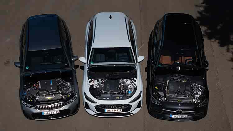 奔驰C级、奥迪A5和BMW 3系:从新一代A5开始,这场对决的排名是这样的。然而,这次不再是柴油旅行车或汽油轿车的较量,而是三款搭载插电混合动力系统,约300马力系统功率的旅行车比拼。这个复杂的概念,将两种基本独立的驱动方式结合起来,重新洗牌了这个市场。
