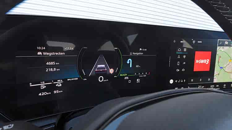 更多缺点?当然还有:测试车缺少胎压显示功能(需额外支付300欧元),停车摄像头的图像显示非常迟缓,甚至有时出现卡顿,这在其他A5车型中也有出现。遗憾的是,虽然宝马和奔驰使用了不太直观的3D视角显示,奥迪则可以选择传统的视角显示,比如前轮视角。然而,快速倒车时最好不要使用。