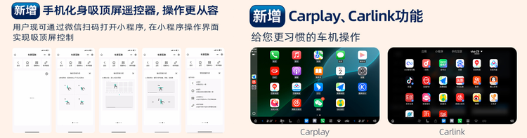 智能互联方面,手机可遥控二排吸顶屏,操作更便捷;Carplay和Carlink功能也同步上线,微信定位一键发送到车,地图可随心增加途经点,便于途中探访亲友或顺路购物,出行规划更显灵活。