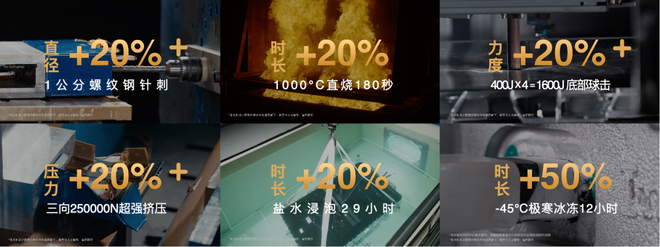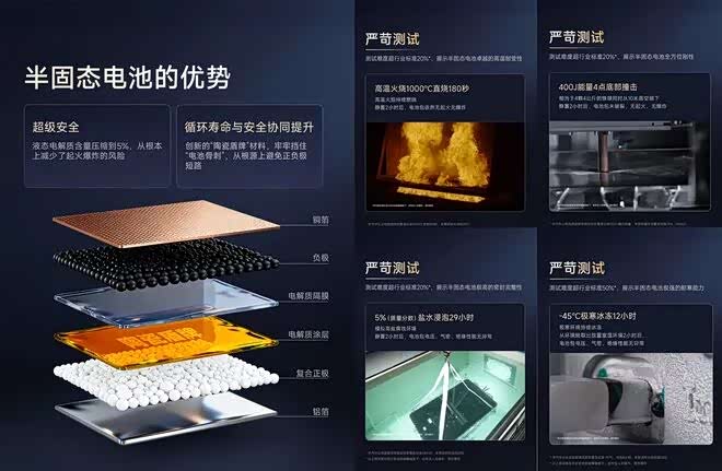 其搭载的半固态电池技术,经过中汽中心最严苛的行业安全测试,包括螺纹钢穿刺、三向极限挤压、盐水浸泡、极寒冰冻、底部球击以及高温火烧等极端工况的终极检验,电池均未起火、未爆炸。测试超出行业最高标准至少20%,大幅超越最新国标,为行业树立了电池安全新标杆。