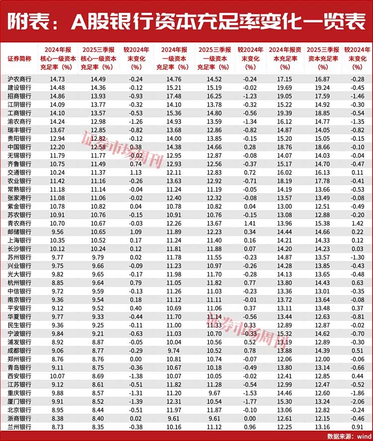 根据上市银行公告,2025年三季度末,42家A股上市银行资本充足率呈现集体回调态势。Wind数据显示,行业核心一级、一级及整体资本充足率较2024年末分别下滑0.17个、0.14个和0.31个百分点,部分区域城商行、农商行降幅相对显著。不过值得关注的是,目前所有上市银行资本水平均守住监管红线,未突破《商业银行资本管理办法(试行)》规定的最低要求。