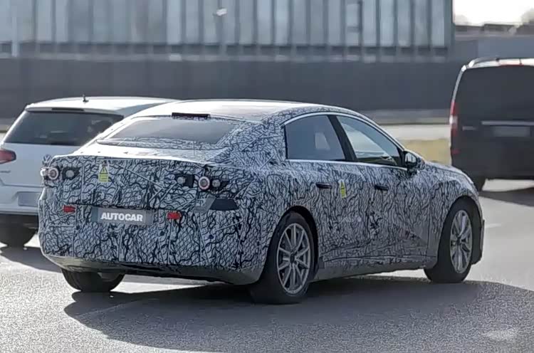 车身侧面是低风阻的轿跑化轮廓,车顶曲线从B柱往后滑,形成流畅的溜背造型。外后视镜下移到车门侧面,视野盲区变小了,风阻系数也降低了。测试车用的是密辐式轮圈,能减少高速行驶时的气流扰动,提升能效。车尾设计简约大气,预计会用和车头呼应的贯穿式LED尾灯,尾厢边缘的小扰流装饰既好看又有实际空气导流作用。得益于纯电平台,新车轴距可能比燃油版长,车内空间更宽敞。