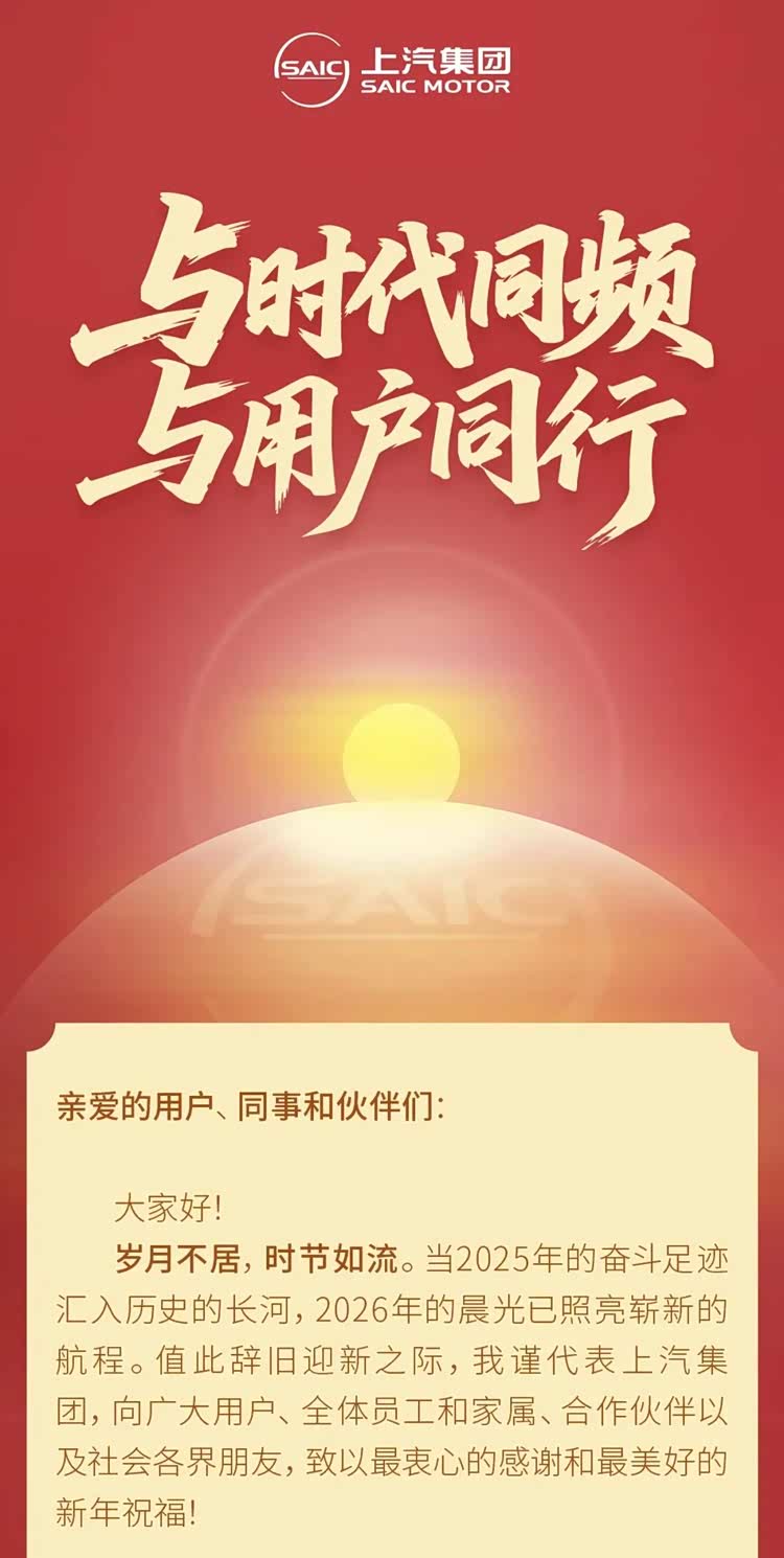 潮平岸阔催人进,风正扬帆正当时。上汽集团的 2026 新年贺词,是一份改革攻坚的成绩单,更是一曲与时代同频、与用户同行的奋进之歌。