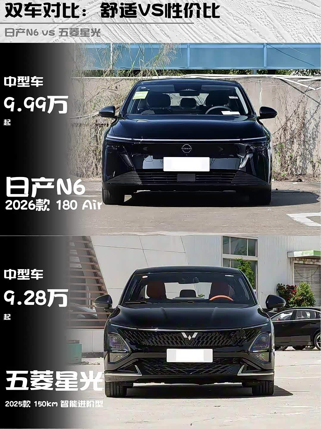 最近被这两台车刷屏了!作为新能源家用车市场的两大卷王,2026款日产N6 180 Air和2025款五菱星光150km智能进阶型,到底该怎么选?实测对比干货送上👇