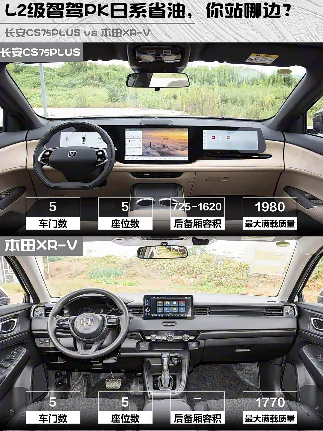 CS75PLUS后排能跷二郎腿,后备箱725L秒变1.6米露营床,31处储物格连雨伞槽都配了!XR-V虽小但后排魔术座椅能上翻,放盆栽都不在话下。不过CS75PLUS纯平地台+零重力副驾,全家出游明显更舒服,XR-V后排坐3人稍挤。