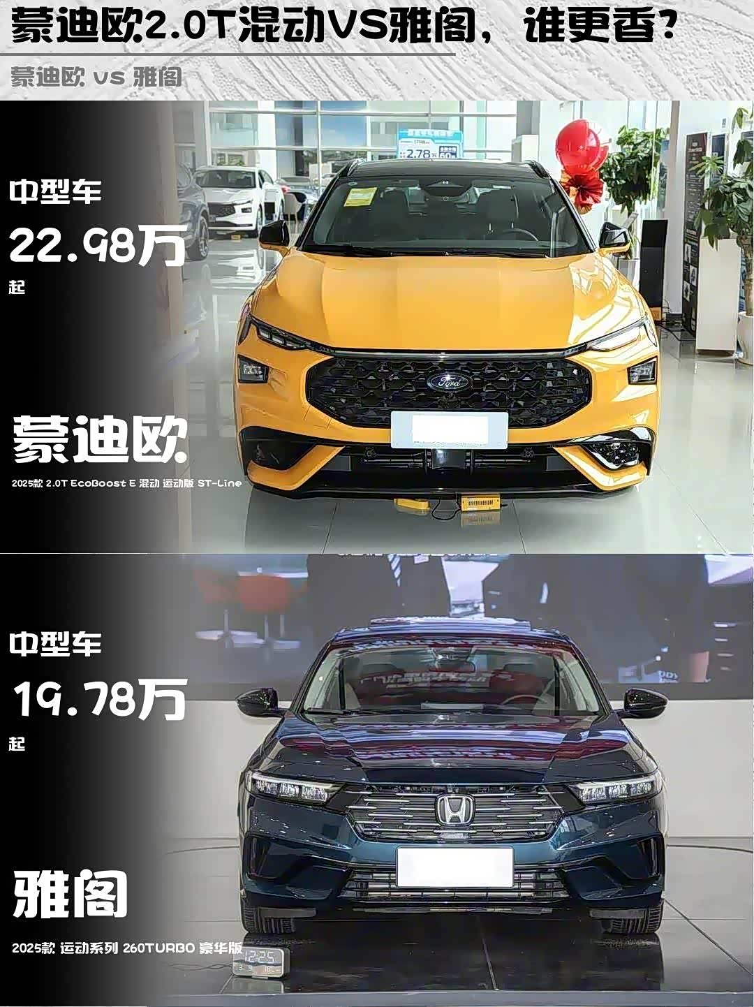 最近试驾了2025款 蒙迪欧(参数|询价)2.0T混动ST-Line和2025款雅阁260TURBO豪华版,两款都是25万级热门B级车,但性格差异大到像两个星球的产物!🔥