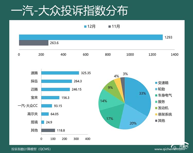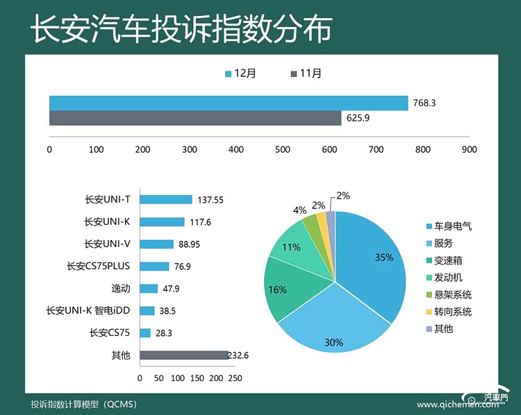 汽车质量投诉点评:12月份,长安汽车的投诉指数同样大幅上升,旗下的UNI-T、UNI-V、逸动PLUS等车型的投诉指数均大涨。从投诉反馈来看,长安的问题仍集中于车身电气和服务两大类,车机卡顿不升级成了最大槽点。另外,本月长安的变速箱问题投诉占比上升到了16%,变速箱顿挫、无法换挡等问题遭到了更多车主的投诉。
