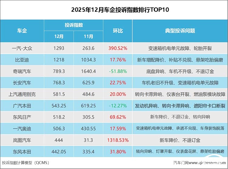 2026年第一天,汽车门网发布了2025年12月份汽车质量投诉指数。刚刚过去的12月,汽车门网的整体投诉指数为15898.55,环比11月大幅上涨了17.5%。