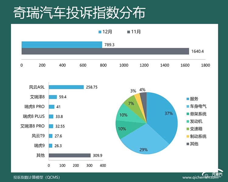 汽车质量投诉点评:经历11月投诉指数大涨之后,奇瑞汽车12月投诉指数大幅回落。从投诉车型分布来看,风云A9L仍然是奇瑞汽车的主要吐槽对象。新车降价增配、下摆臂异响等问题再次招致了老车主的吐槽。与此同时,车机不升级问题也遭到了捷途旅行者、瑞虎8、艾瑞泽8车主的小范围投诉。