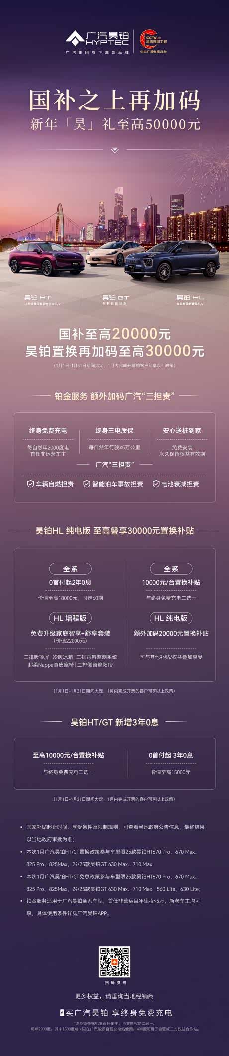 本次带来的“政企双补”礼遇,包括国补部分至高20000元,昊铂品牌置换再加码至高30000元,两者叠加后,用户可享至高50000元购车补贴。
