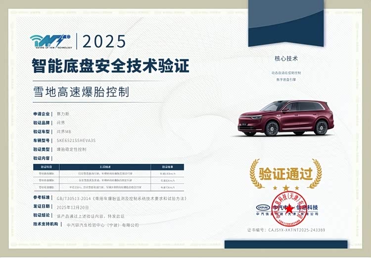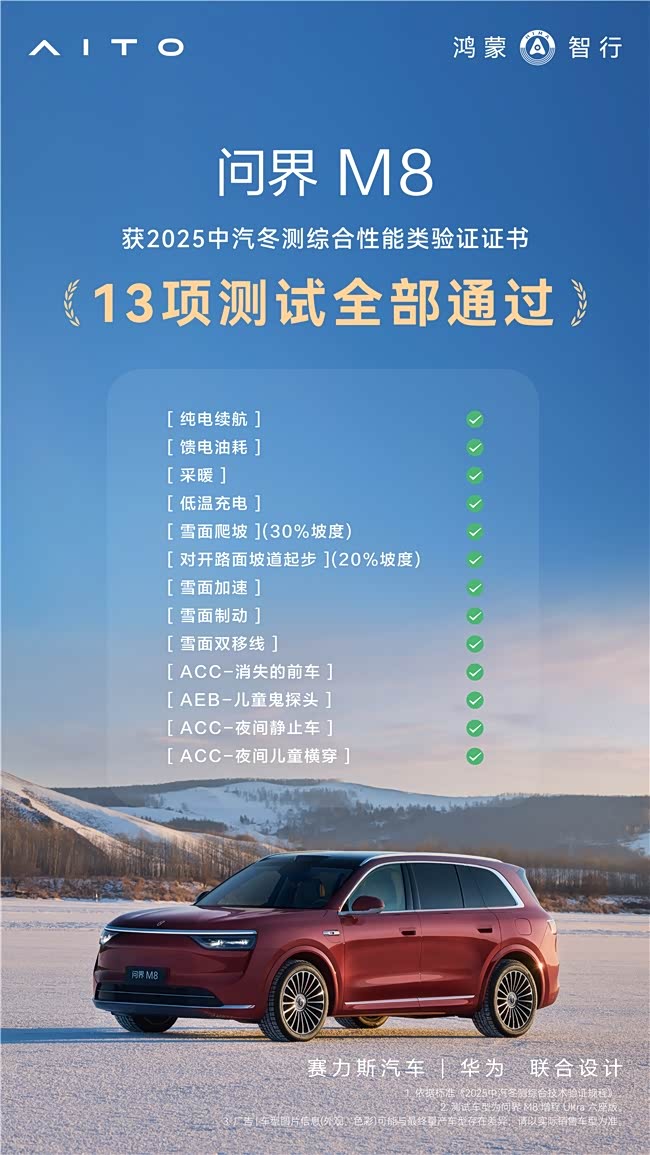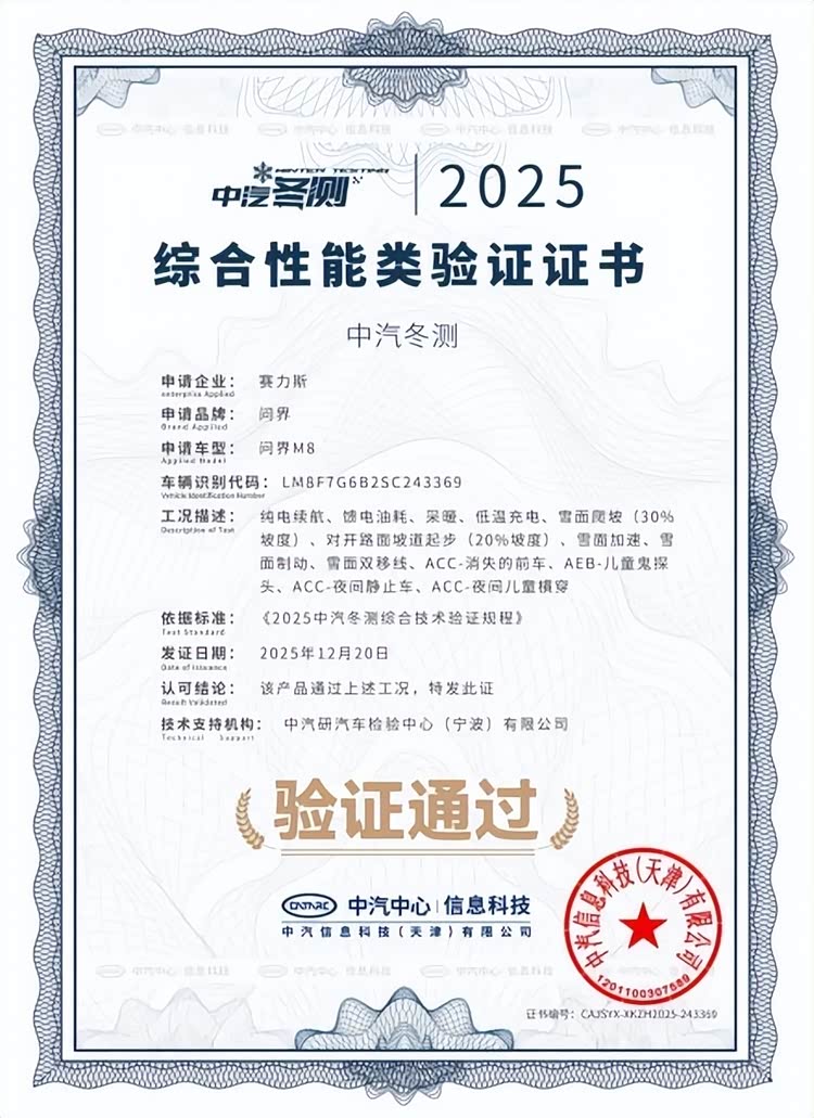 严寒是检验车辆真实力的终极试金石。近日,一份来自极寒之地的权威报告引发关注:在中汽中心组织的2025中汽冬测中,问界M8凭借全方位过硬素质,成功斩获“综合性能类验证”与“智能底盘安全技术验证”双项权威认证。