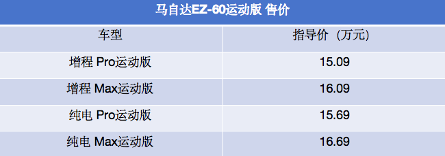 而根据官方信息显示,马自达EZ-60增程Pro运动版相比增程200 Pro、增程Max运动版相比增程200 Max、纯电Pro运动版相比纯电600 Pro、纯电Max运动版相比纯电600 Max,官方指导价均高出6000元,除了上述提及的专属元素外,其余功能配置、动力等没有变化。