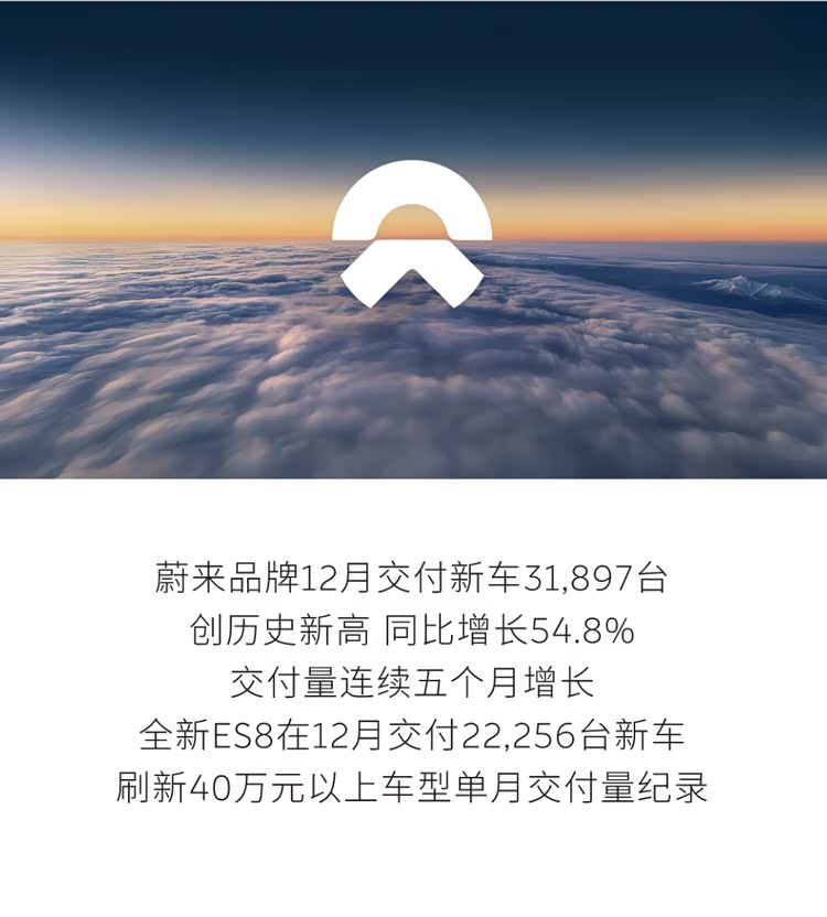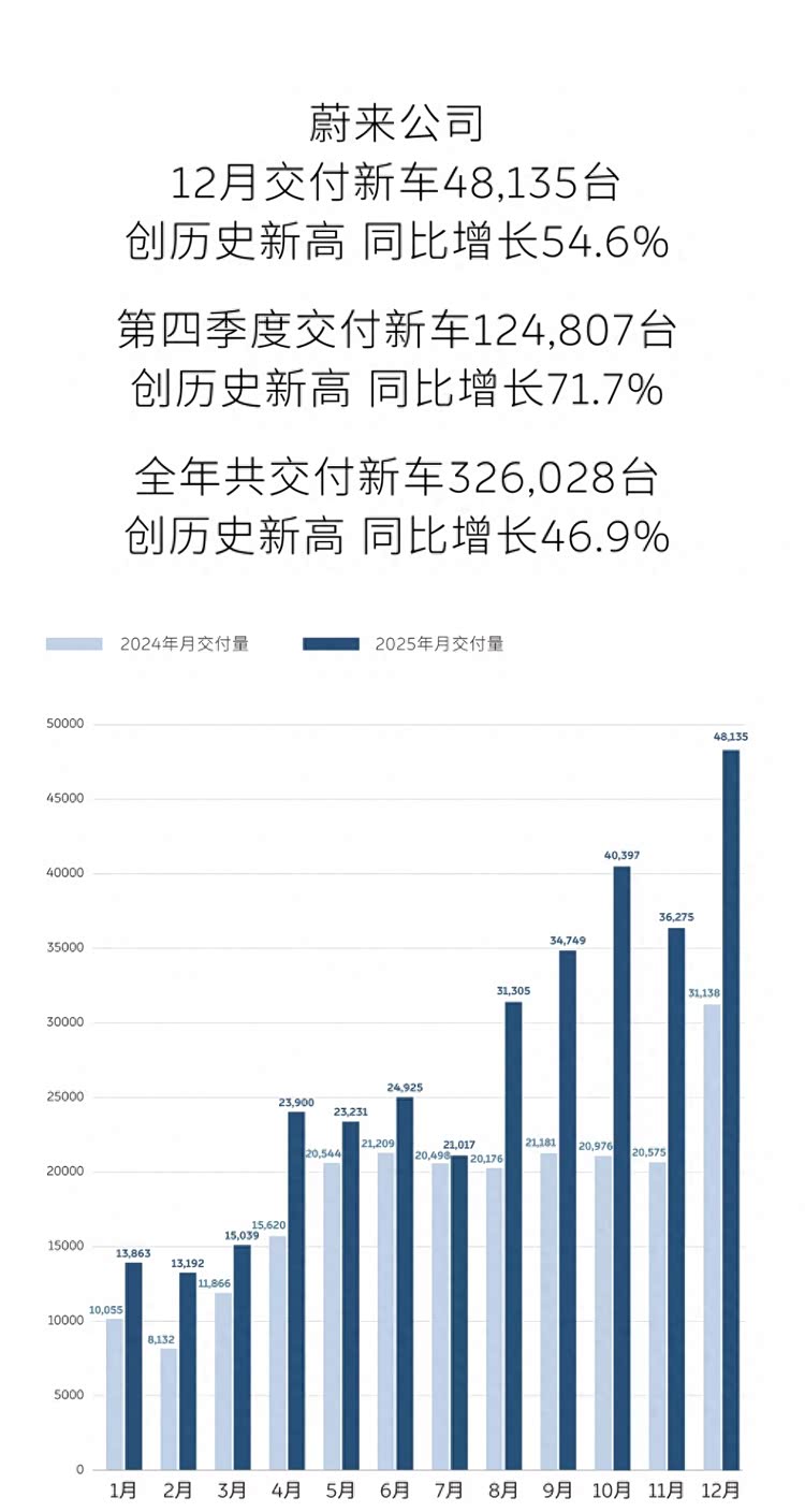 2025年12月,蔚来公司交付新车共计48135台,创历史新高,同比增长54.6%,全新 ES8(参数|询价)交付22256台。