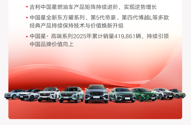 这种价值向上的驱动力,也反哺并提升了整个吉利品牌矩阵的基调。吉利品牌旗下的“中国星”高端系列,年销量近42万辆,持续引领着中国品牌在燃油车领域的价值突破。银河品牌虽然主攻主流新能源市场,但其产品在设计、科技和质感上的越级表现,也整体拉升了吉利在消费者心中的价值感知。从“中国星”到银河,从领克到极氪,一个衔接紧密、价值逐级提升的品牌阶梯已然成型,它们相互呼应,共同托举起“吉利”二字背后的技术形象与价值内涵。