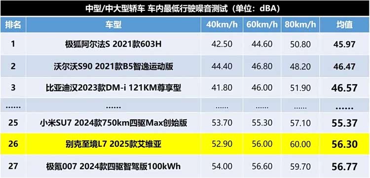 经测试,别克至境L7在40km/h速段下的车内最低行驶噪音均值为53.2dBA;60km/h速段下为56.8dBA;80km/h速段下为59.0dBA。综合三个速段数据计算,车内最低行驶噪音均值为56.30dBA,这个成绩在我们测试过的中型和中大型轿车当中,排名倒数第二,很明显是被轮胎拖了后腿。