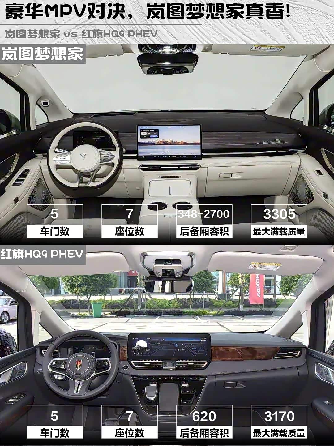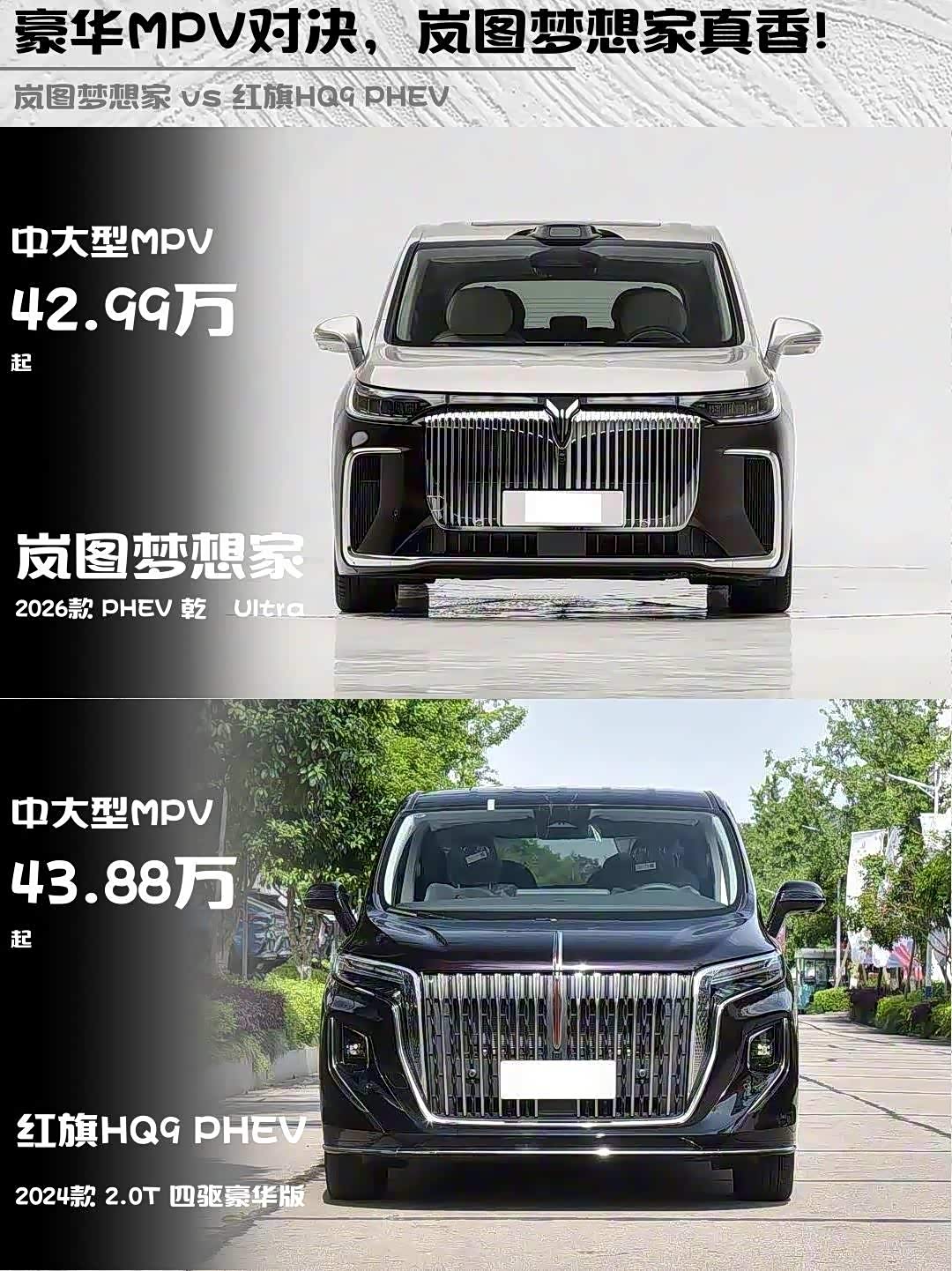 最近深度体验了岚图梦想家2026款 PHEV 乾崑Ultra和 红旗HQ9 PHEV(参数|询价) 2024款 2.0T 四驱豪华版两款豪华MPV,作为40万+级别的插混选手,它们各自的特点太鲜明了!分享一下真实感受给正在纠结的兄弟们👇