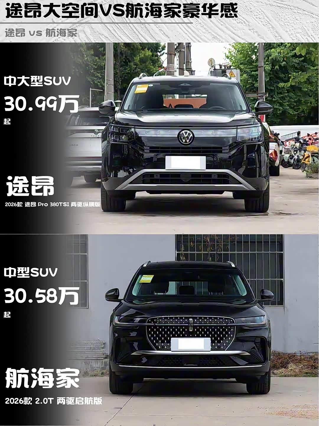 车家号·0浏览·2026-01-02 08:17 · 北京最近在选30万级SUV的朋友看过来!今天深度对比两款热门选手——2026款 途昂(参数|询价)Pro 380TSI两驱纵横版和2026款航海家2.0T两驱启航版,实测干货直接上菜🔥