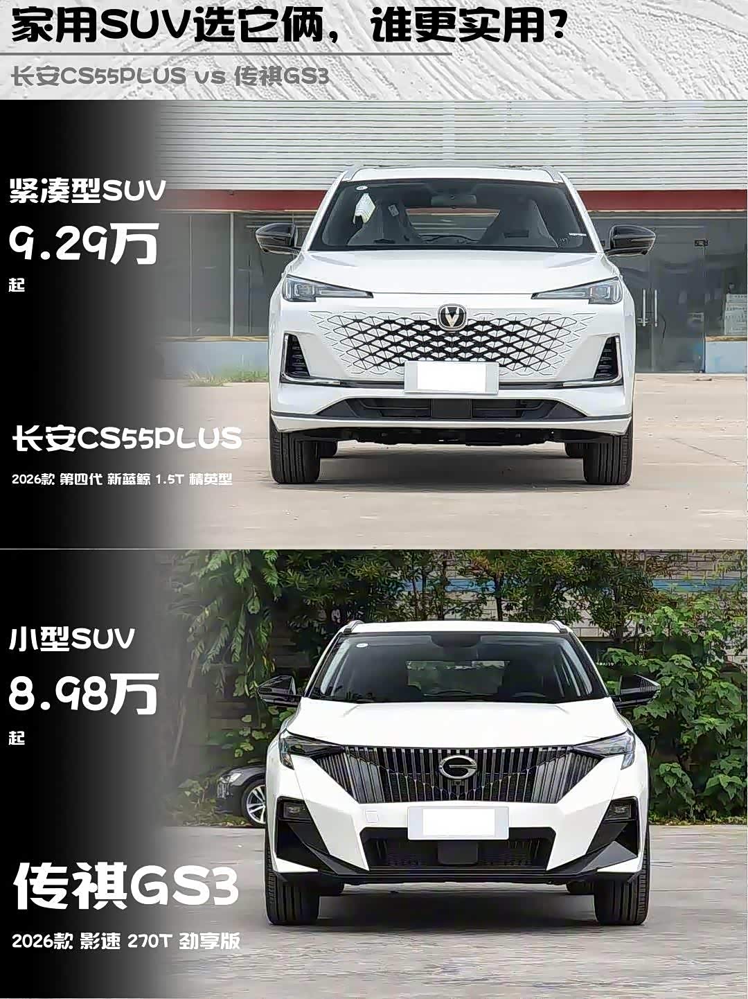 车家号·0浏览·2026-01-02 08:24 · 北京最近在选10万级SUV的朋友看过来!今天深度对比两款热门车型—— 长安CS55PLUS(参数|询价) 2026款 第四代 新蓝鲸 1.5T 精英型 vs 传祺GS3 2026款 影速 270T 劲享版,实测干货分享给你们🔥